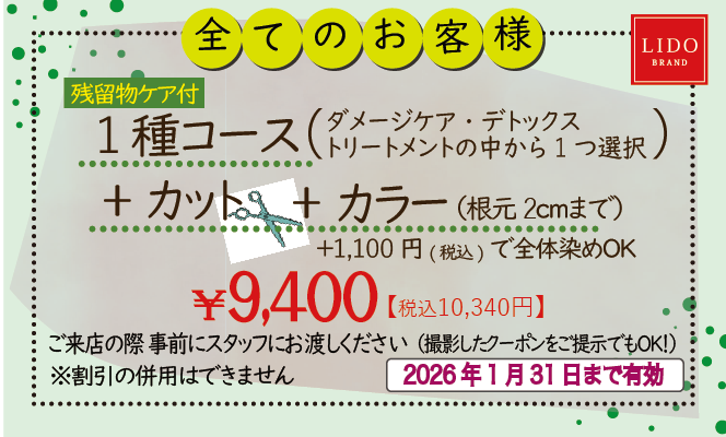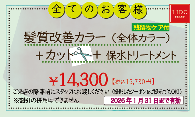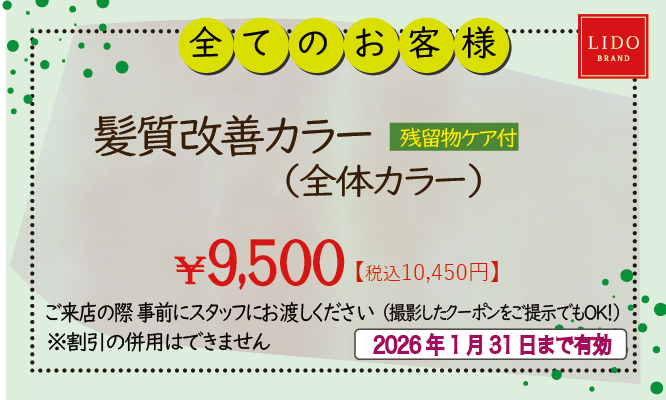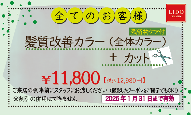 【全てのお客様】 髪質改善コースの全体カラー+カットのご優待クーポン★ (撮影したクーポンをご提示されてもOK!) ※一部店舗でお取り扱いしておりません