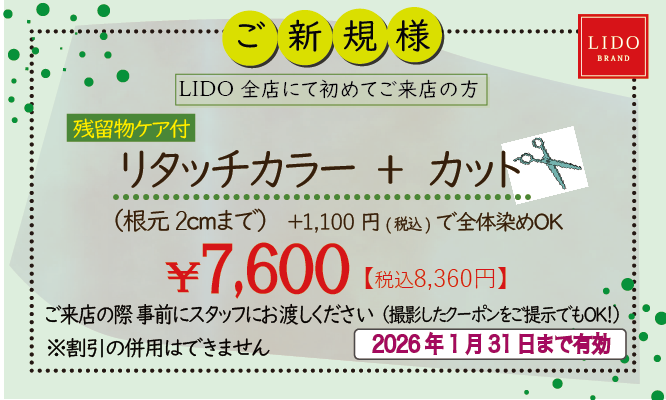 【リド全店に初めてご来店のご新規様限定】 リタッチカラー(根元2cm)+カットのご優待クーポン★ (撮影したクーポンをご提示されてもOK!)