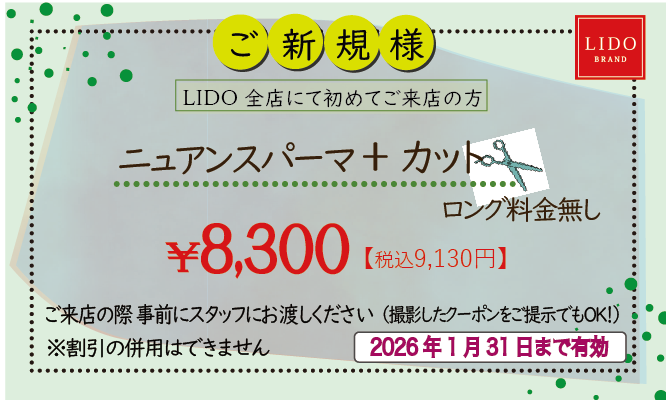 【リド全店に初めてご来店のご新規様限定】 ニュアンスパーマ+カットのご優待クーポン★ (撮影したクーポンをご提示されてもOK!)